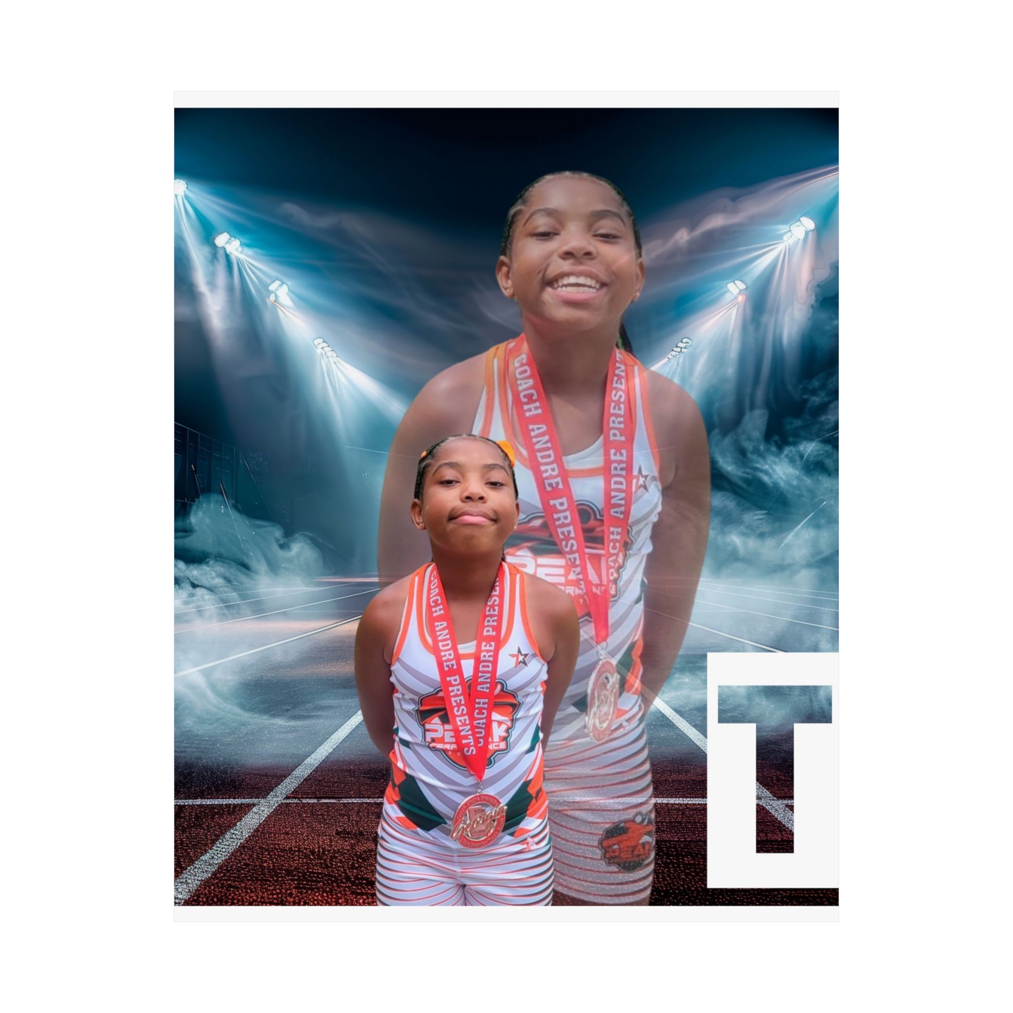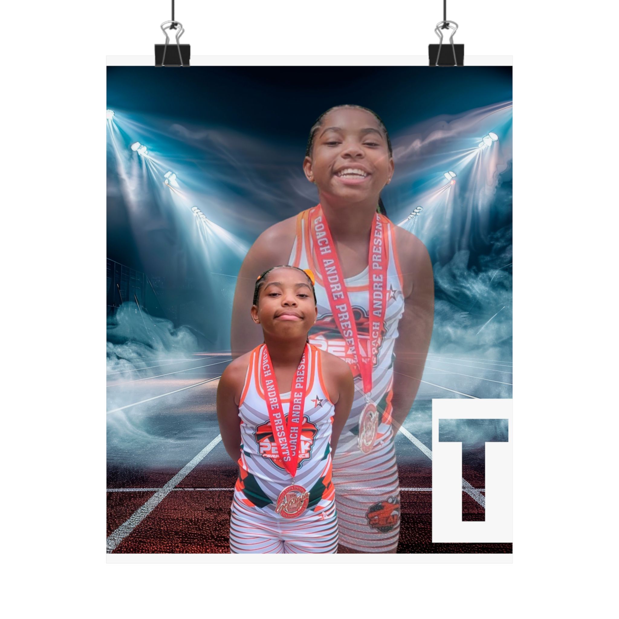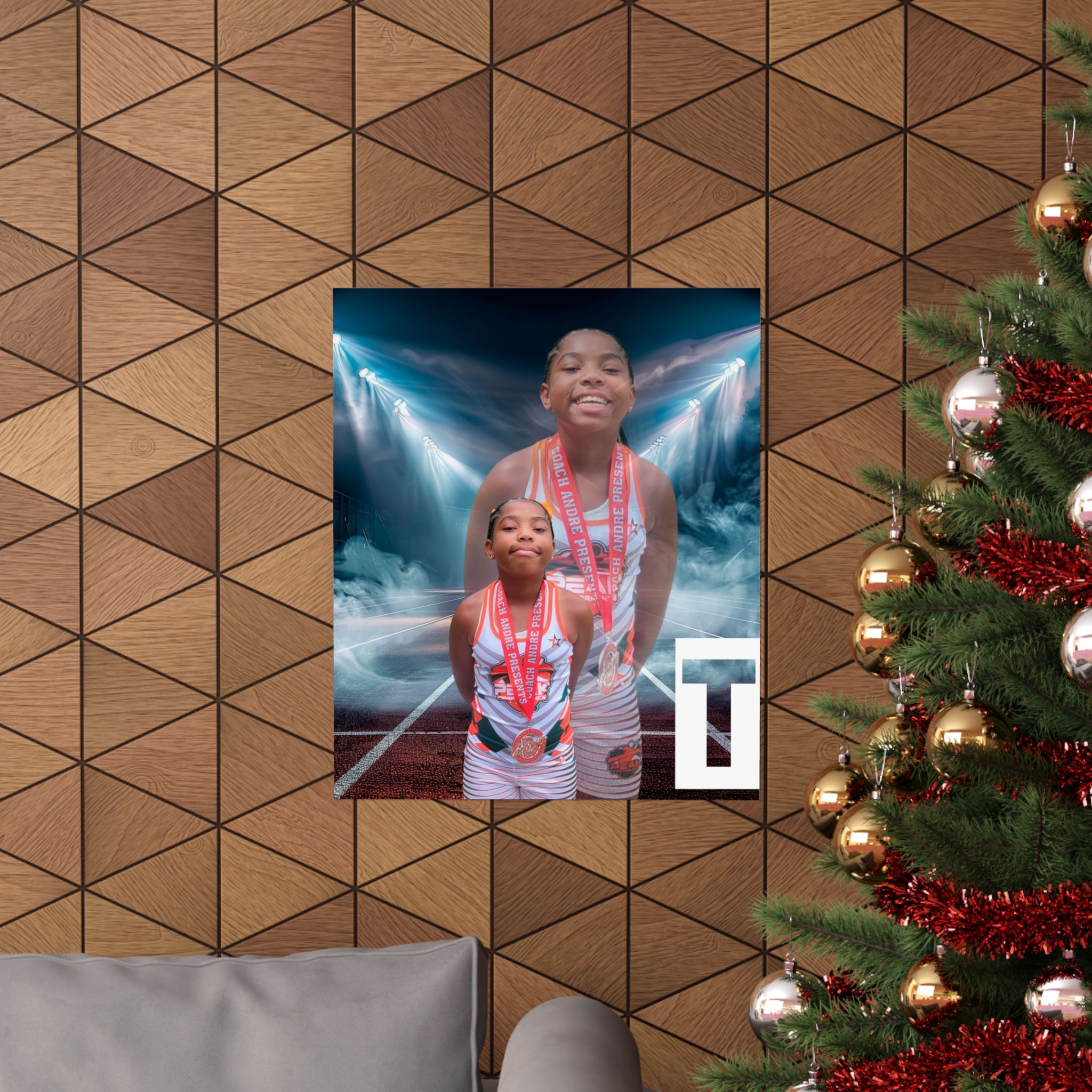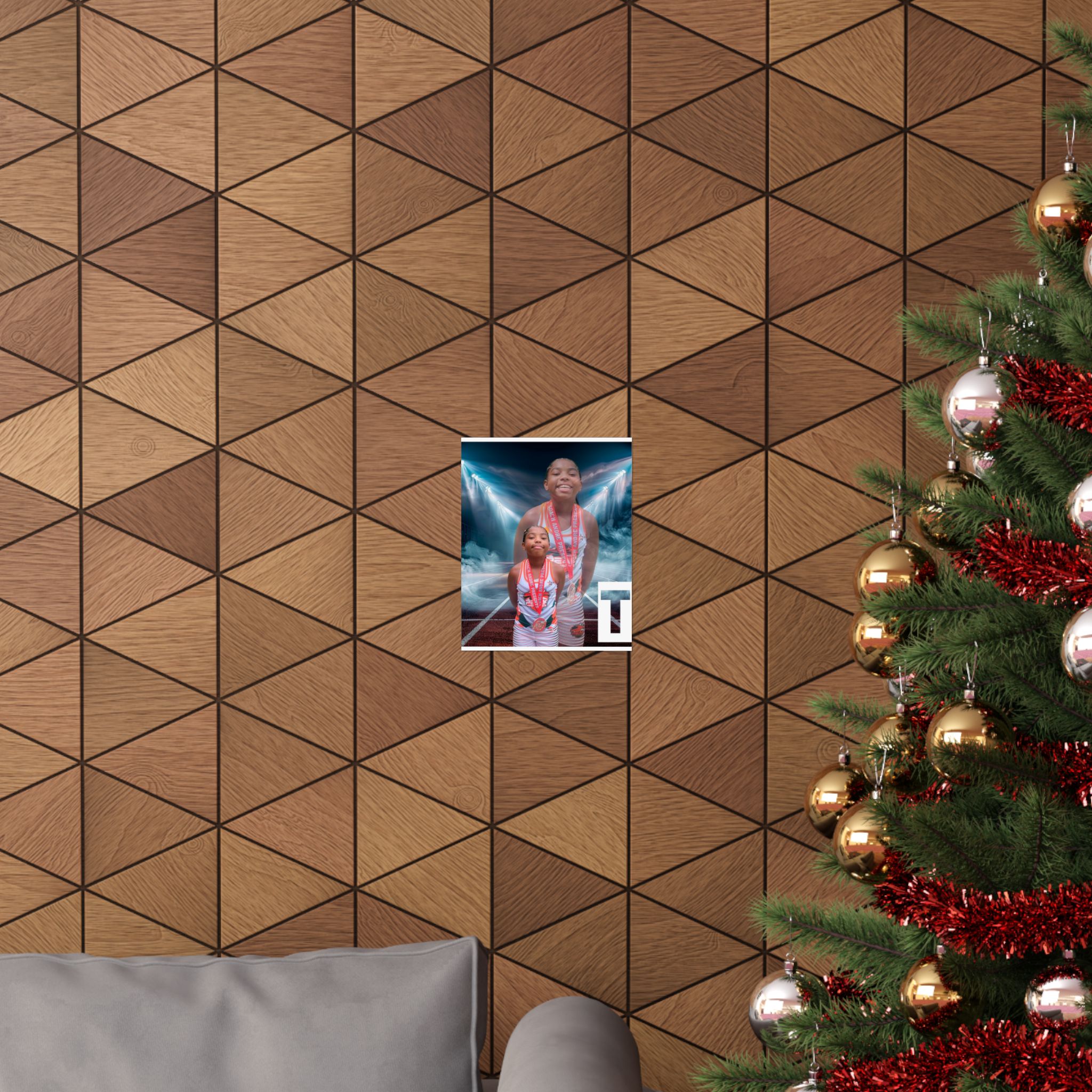 A matte vertical poster that celebrates youthful achievement with crisp, archival quality printing. The image captures a young athlete wearing medals against a dramatic stadium backdrop and ethereal lighting—printed on museum-grade paper with a light-absorbing matte finish to keep colors vivid without glare. This piece brings a personal moment into a gallery-style presentation meant for indoor display: hang it in a bedroom, hallway, or family room to honor hard work and milestone memories. The heavy Giclée inks preserve bright reds and deep blues while the fade-resistant finish keeps the scene bold over time. Slight sizing tolerances are possible due to production processes.