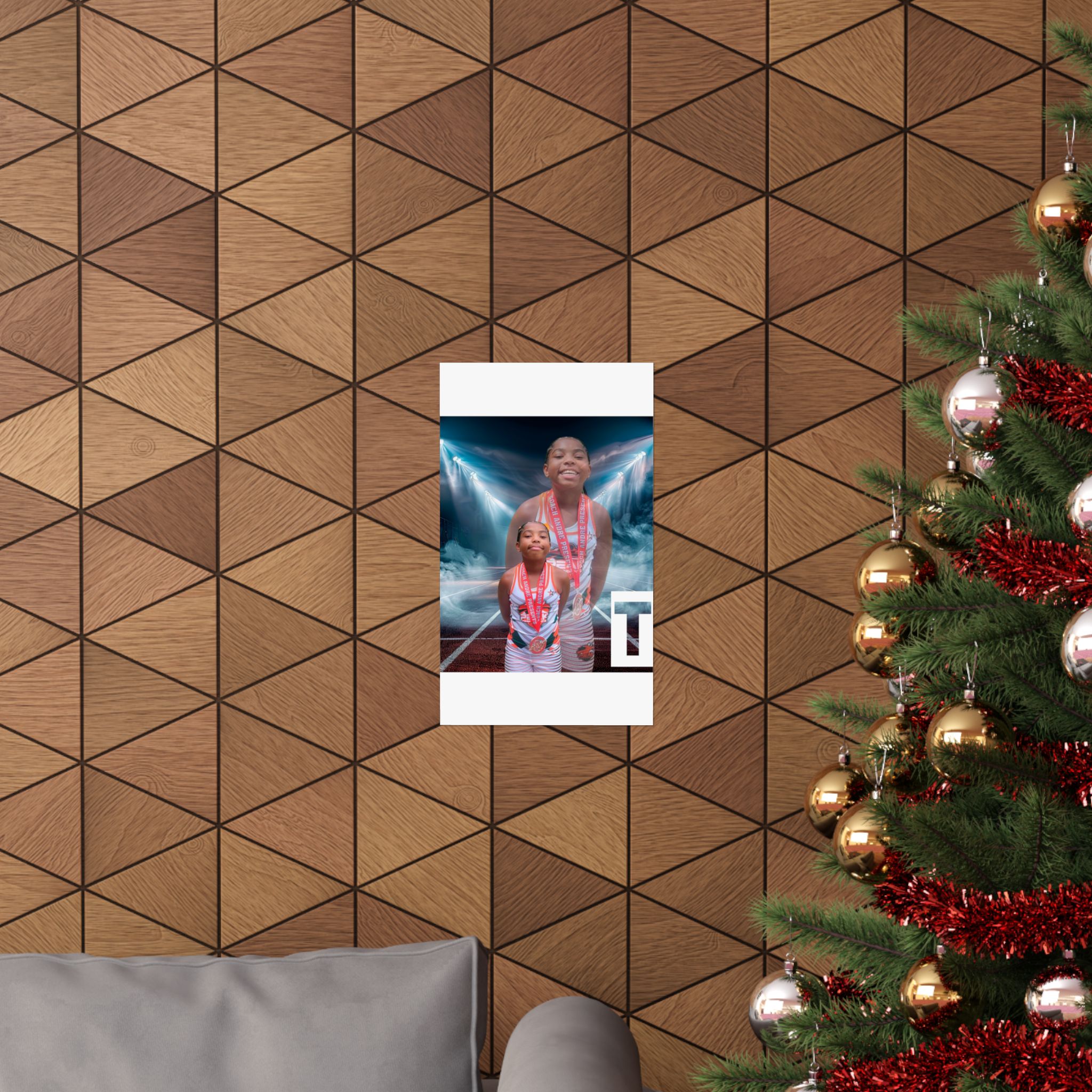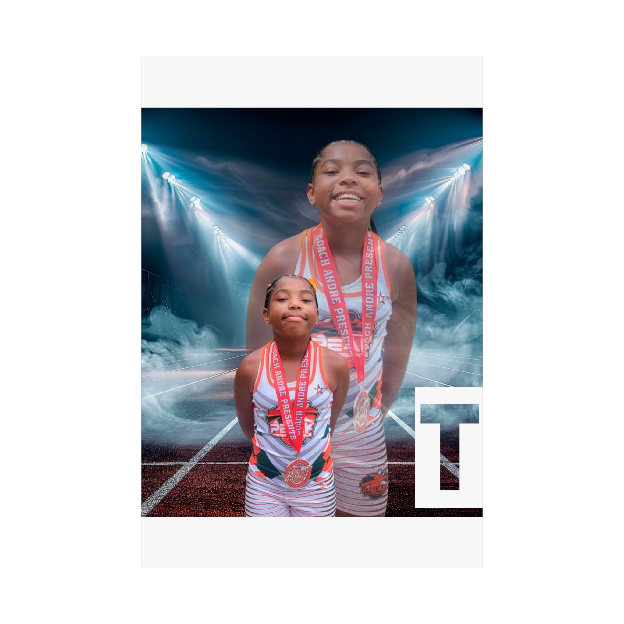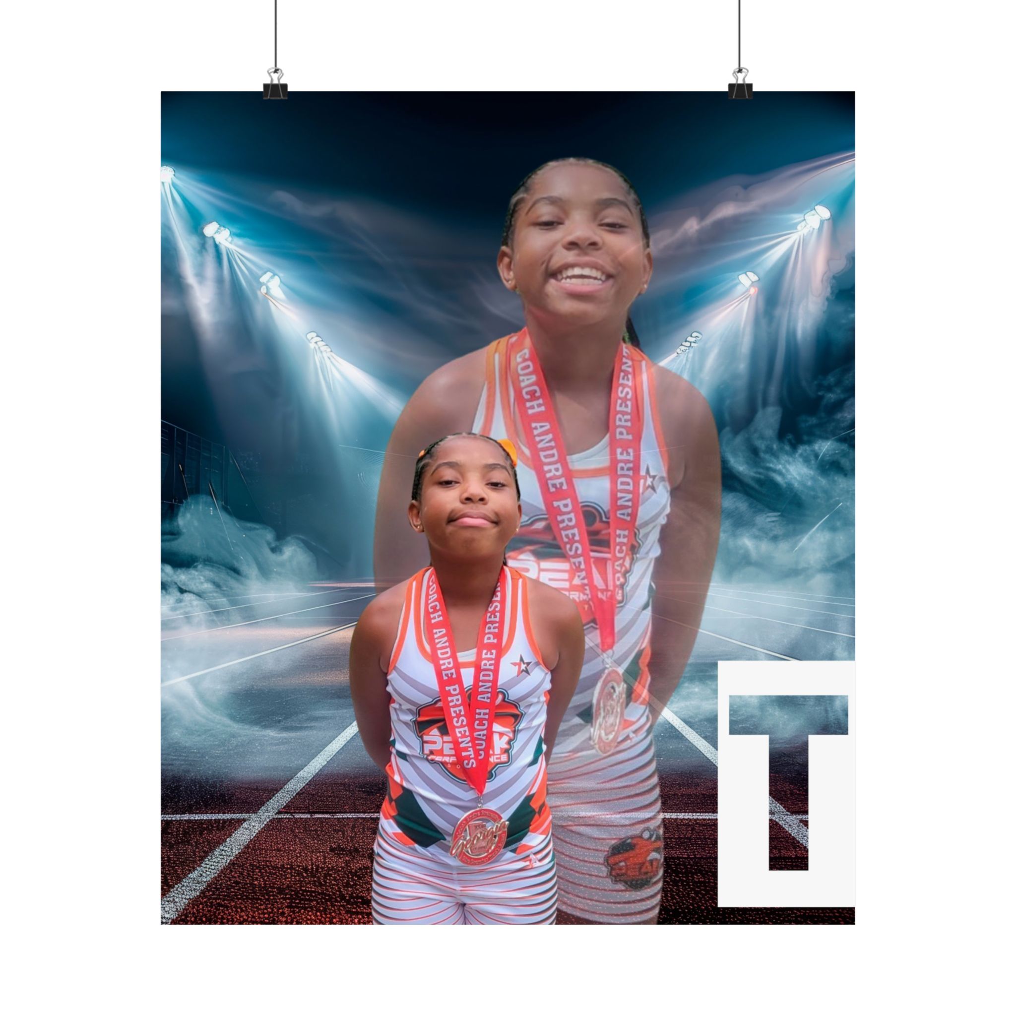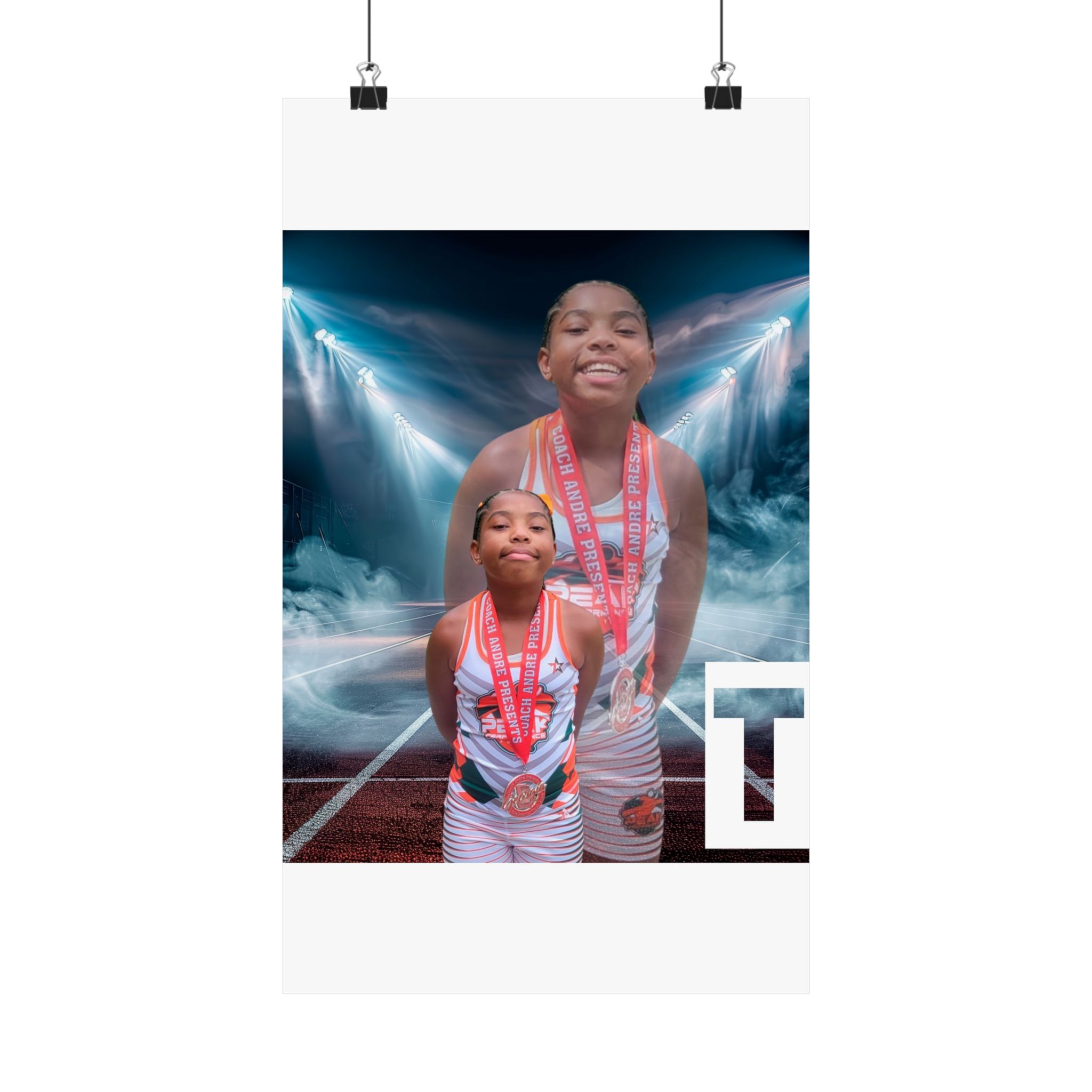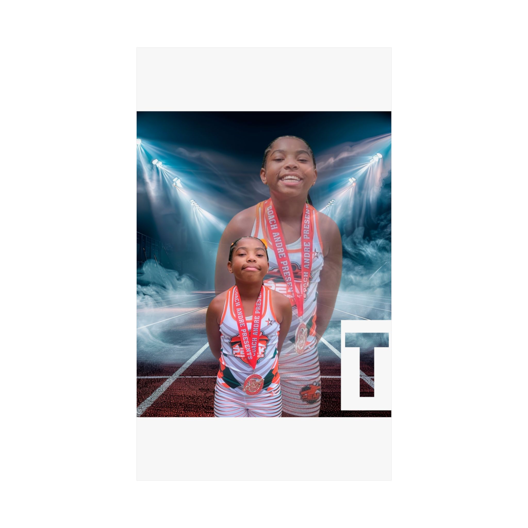 A matte vertical poster that celebrates youthful achievement with crisp, archival quality printing. The image captures a young athlete wearing medals against a dramatic stadium backdrop and ethereal lighting—printed on museum-grade paper with a light-absorbing matte finish to keep colors vivid without glare. This piece brings a personal moment into a gallery-style presentation meant for indoor display: hang it in a bedroom, hallway, or family room to honor hard work and milestone memories. The heavy Giclée inks preserve bright reds and deep blues while the fade-resistant finish keeps the scene bold over time. Slight sizing tolerances are possible due to production processes.